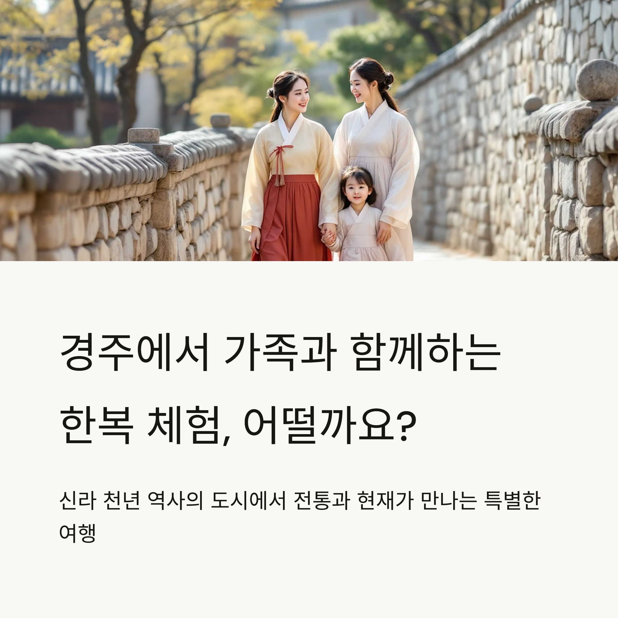 이번 주말 혹은 다음 휴가, 가족과 함께할 여행지를 찾고 있다면 ‘경주’와 ‘한복 체험’이라는 조합을 꼭 고려해 보세요. 전통과 현재가 어우러지는 그 길에서, 여러분도 잊지 못할 추억을 만나실 수 있을 겁니다.