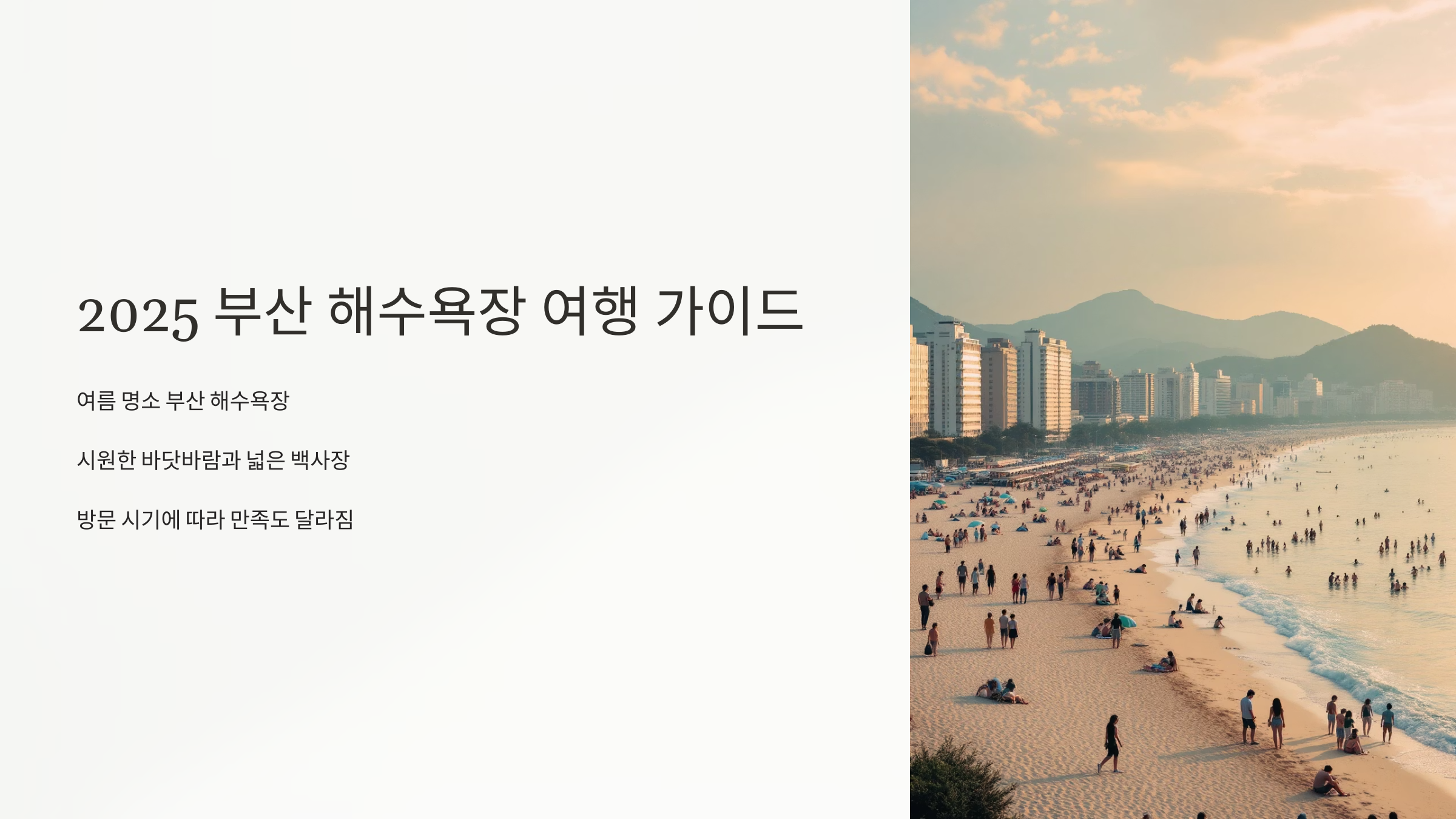 뜨거운 여름이 다가오면 가장 먼저 떠오르는 국내 여행지 중 하나는 단연 부산입니다. 특히 시원한 바닷바람과 넓은 백사장을 품은 부산 해수욕장은 매년 수많은 여행객이 찾는 여름 명소이죠. 하지만 언제 가느냐에 따라 분위기와 혼잡도, 여행의 만족도는 천차만별입니다.