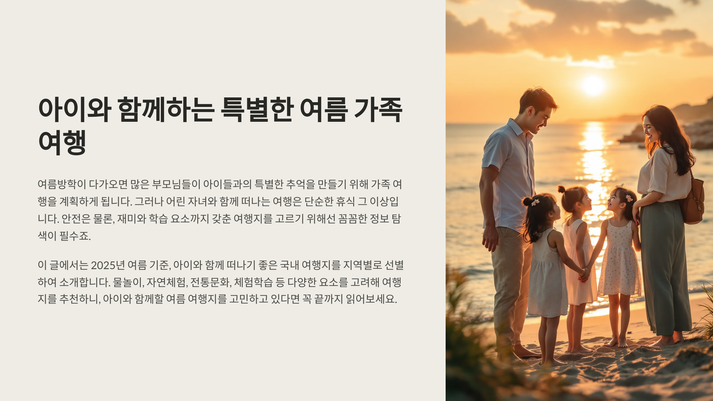 여름방학이 다가오면 많은 부모님들이 아이들과의 특별한 추억을 만들기 위해 가족 여행을 계획하게 됩니다. 그러나 어린 자녀와 함께 떠나는 여행은 단순한 휴식 그 이상입니다. 안전은 물론, 재미와 학습 요소까지 갖춘 여행지를 고르기 위해선 꼼꼼한 정보 탐색이 필수죠. 이 글에서는 2025년 여름 기준, 아이와 함께 떠나기 좋은 국내 여행지를 지역별로 선별하여 소개합니다. 물놀이, 자연체험, 전통문화, 체험학습 등 다양한 요소를 고려해 여행지를 추천하니, 아이와 함께할 여름 여행지를 고민하고 있다면 꼭 끝까지 읽어보세요.