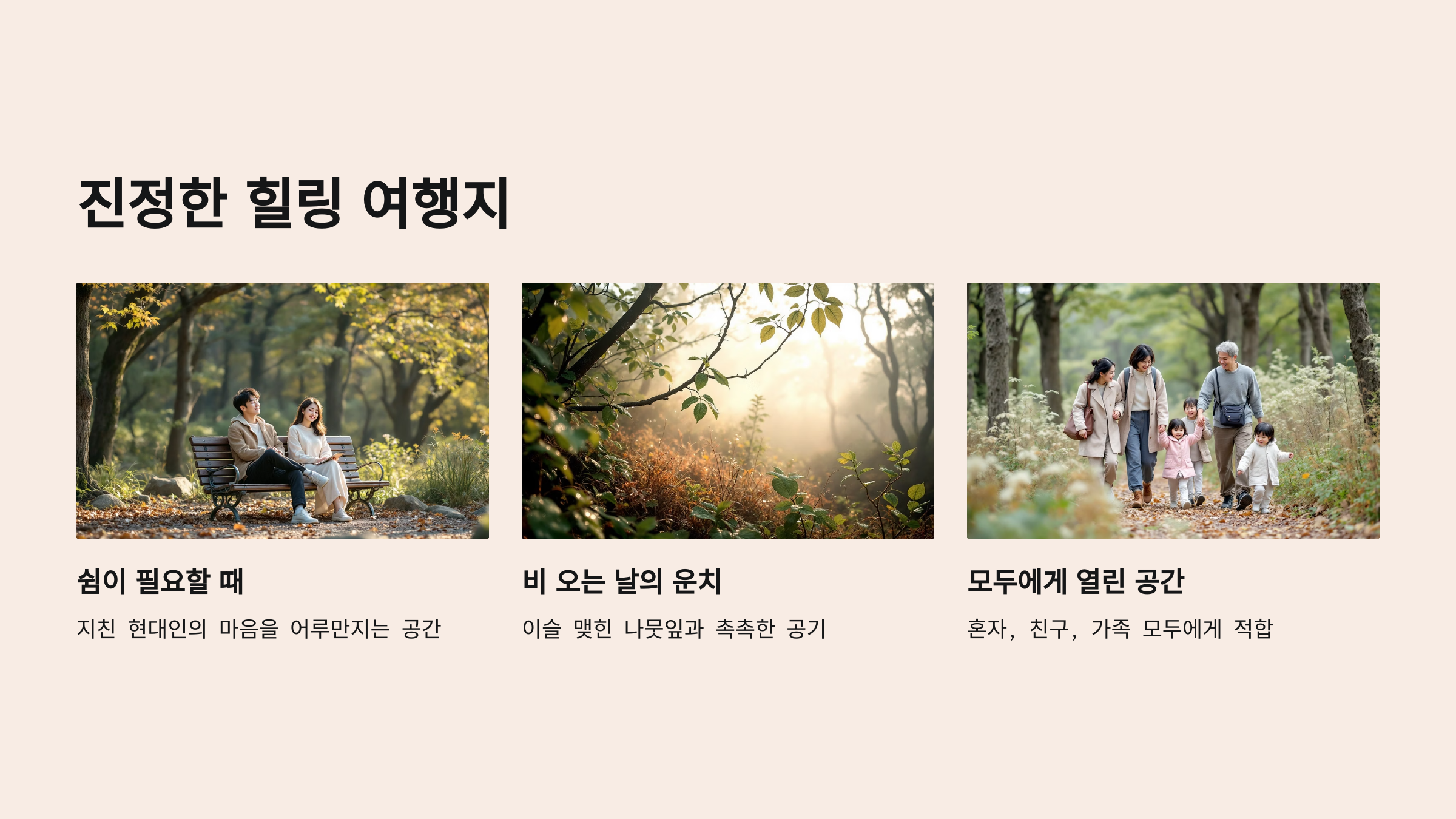 걷는 동안 자연스럽게 호흡이 깊어지고, 숲의 향과 공기를 들이마시며 마음도 차분해집니다. 실제로 산림청의 조사에 따르면 숲을 자주 찾는 사람들은 우울증, 불면증, 만성피로 증상이 크게 줄어든다고 합니다. 숲을 걷는 것만으로도 몸과 마음이 정화되는 셈입니다.